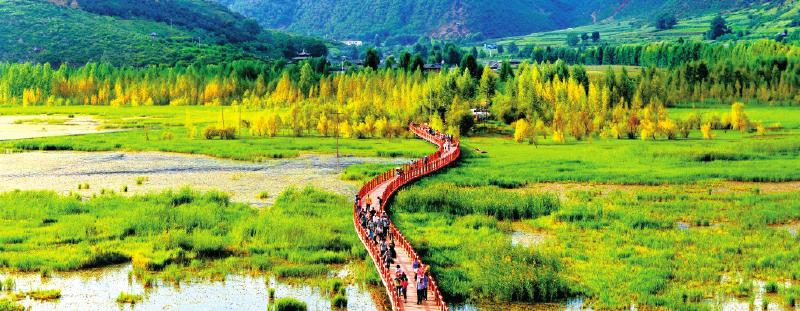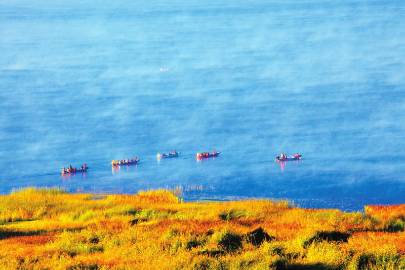 9月初,走在今年新建好的2.8公里情人牧场生态木栈道上,仿佛穿行于花海中,云海与湖水都是那样湛蓝。湖边的草地上,绵羊在悠闲地吃草。浪漫的霞光洒下,更添一层橘黄衣衫。