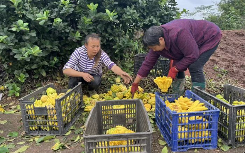 (李旭 文/图)金秋时节,富顺县李桥镇腰塘村川佛手现代农业产业园内,1300余亩佛手相继成熟。金黄饱满的果实挂满枝头,清香四溢,呈现出一派喜人的丰收图景。采收现场近日,笔者在采收现场看到,农户们背着背篓、手持工具穿梭林间,熟练地采摘果实。采摘后的佛手经分拣、装箱后,集中运往加工车间。整个流程井然有序,田间地头洋溢着丰收的忙碌与喜悦。据产业园业主江先华介绍,腰塘村川佛手种植面积达1300多亩,采摘期从每年7月持续至12月底,部分果树还呈现出“花果同株”的独特景观。“今年产量与往年基本持平,”他补充道,“基地日常用工约30至40人,采收旺季用工需求还将进一步增加。”作为当地主导产业,腰塘村川佛手产业正持续沿着“延链补链强链”的方向稳步推进。驻村第一书记郭坤伦表示,村里将聚焦佛手果粒、佛手茶、老香黄等深加工产品研发,不断提升产品附加值和品牌影响力。目前,该产业已形成“规模化、集约化、益农化”的发展格局,通过整合中省扶持资金、脱贫攻坚项目资金和社会投资,构建起以川佛手为核心的“3+N”集体经济产业体系。采收现场值得一提的是,李桥镇川佛手现代农业园区已辐射腰塘、石高、小桥3个村29个小组,其核心区腰塘村于2023年11月成功创建为市级现代农业园区。园区培育了自贡市君海农业科技有限公司作为精深加工龙头企业,通过“公司+基地”模式提供长期工作岗位150余个,每年促进农户增收150余万元。2024年,腰塘村村集体经济收入首次突破100万元,在全县率先实现分红,联农带农富农效应显著。根据发展规划,园区2025年预计产量将达600万斤,产值有望突破2000万元。未来,李桥镇腰塘村还将继续深化“产村融合赋动能 富民兴农促振兴”的发展路径,进一步优化联农带农机制,推动川佛手产业提质增效,让产业发展成果更多惠及村民,为乡村振兴注入持久动力。