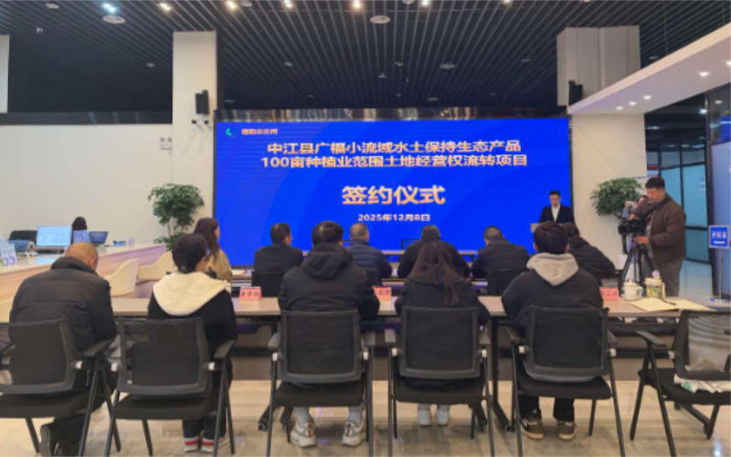 (谭雪 记者 刘金蓉 文/图)12月8日,德阳农交所交易大厅内,中江县广福镇小流域水土保持生态产品100亩种植业范围经营权流转项目举行签约仪式,标志着德阳市在水土保持生态产品市场化交易领域迈出实质性一步。签约现场现场,项目业主与流入方代表签订《水土保持生态产品经营权交易项目合同》,德阳农交所负责人谢玉萍为双方颁发《交易鉴证书》,德阳市水利局调研员李嘉为双方颁发《水土保持生态产品交易凭证》。据了解,此次中江县广福镇小流域水土流失综合治理项目于2021年12月竣工验收,通过实施坡改梯、营造水土保持林等工程措施,该区域生态系统服务能力得到显著提升,为后续经营权流转奠定了坚实基础。2025年11月,德阳农交所按照《水土保持生态产品交易业务规则》,指导项目业主完成交易申请资料准备,规范履行内部决策及审批程序,通过公开挂网,共征集到德阳丰科农业科技有限公司一名符合资格条件的意向流入方,最终按公告条件达成交易,流转期限2年,流转价格每年55000元。签约现场此次交易成功签约,推动了生态优势变经济优势、生态“颜值”变“产值”,有力促进了生态保护与经济发展的良性互动,构建了德阳市水土保持生态产品交易模式,拓展了水土保持生态产品价值实现路径,有效推动了德阳市水土保持持续高质量发展。